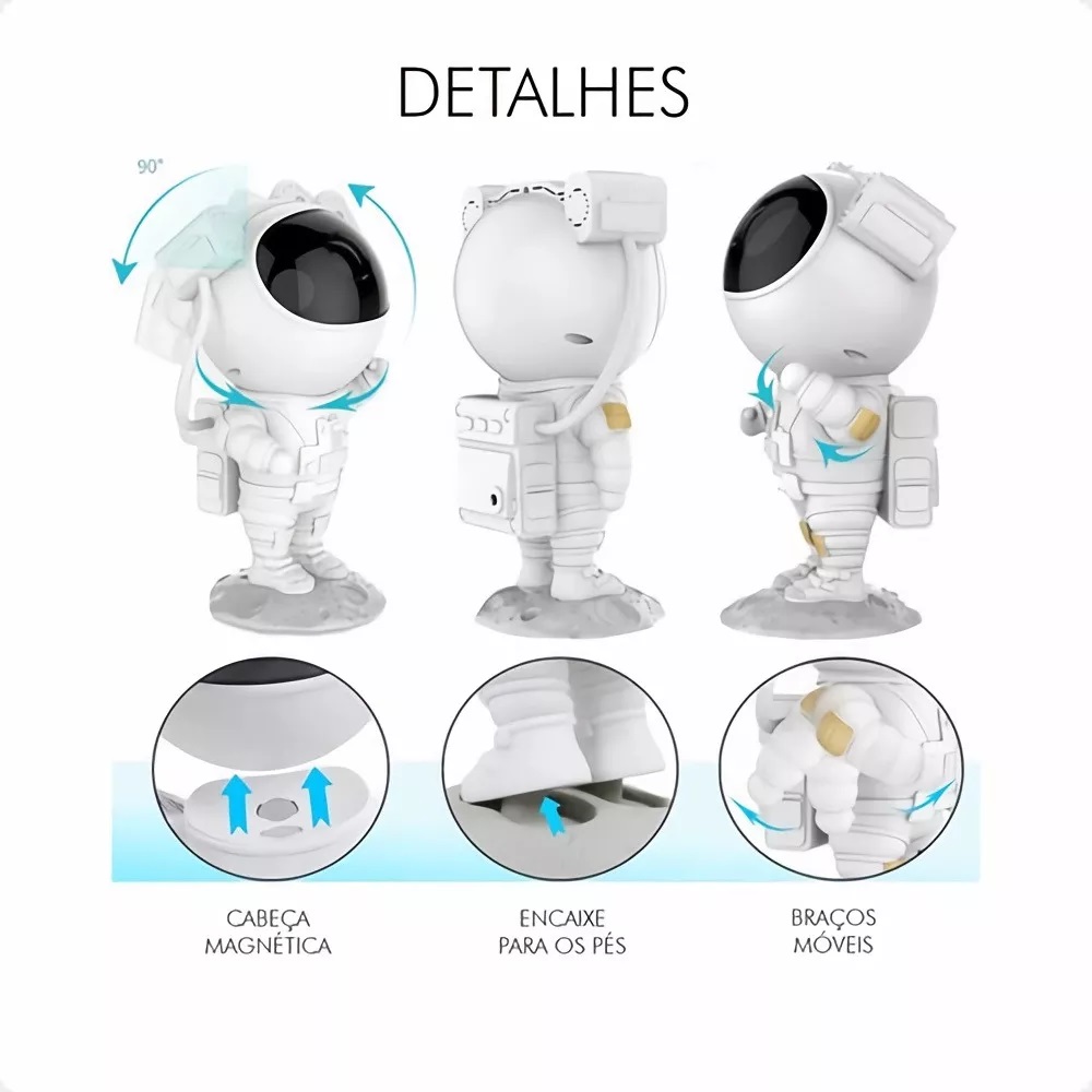 Com um efeito SUPER REALISTA, a luminaria possui um projetor de alta definição capaz de transformar o seu ambiente em uma galaxia nebulosa. Possui diversos efeitos de luz rotativos combinados com um laser para representar as estrelas do universo. Com um design inovador e aparência única serve perfeitamente como um item de decoração. A cabeça do astronauta pode girar 360, podendo assim posicionar o efeito em qualquer teto ou parede. Pode ser controlado pelos botões na parte traseira ou via controle remoto.